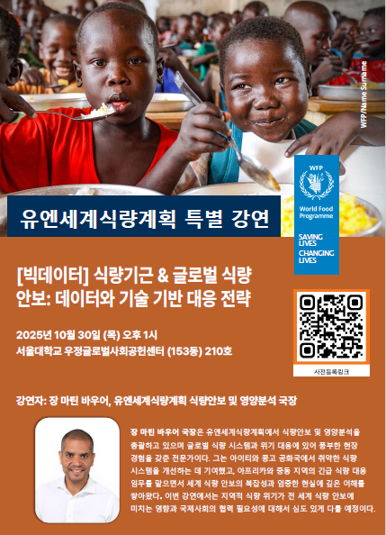 유엔세계식량계획 특별 강연 l 강연 제목: [빅데이터] 식량 기근 & 글로벌 식량 안보: 데이터와 기술 기반 대응 전략 l 강연 일시: 2025년 10월 30일 (목) 오후 1시 l 강연 장소: 서울대학교 우정글로벌사회공헌센터 (153동) 210호 (네이버 지도 링크 https://naver.me/52RN7NnC) l 연사 정보: 장 마틴 바우어, 유엔세계식량계획 식량안보 및 영양분석 국장 <장 마틴 바우어 국장 소개> -유엔세계식량계획에서 식량안보 및 영양분석을 총괄하고 있으며 글로벌 식량 시스템과 위기 대응에 있어 풍부한 현장 경험을 갖춘 전문가이다. -아이티와 콩고 공화국에서 취약한 식량 시스템을 개선하는 데 기여했고, 아프리카와 중동 지역의 긴급 식량 대응 임무를 맡으면서 세계 식량 안보의 복잡성과 엄중한 현실에 깊은 이해를 쌓아왔다. - 이번 강연에서는 지역적 식량 위기가 전 세계 식량 안보에 미치는 영향과 국제사회의 협력 필요성에 대해서 심도 있게 다룰 예정이다. |