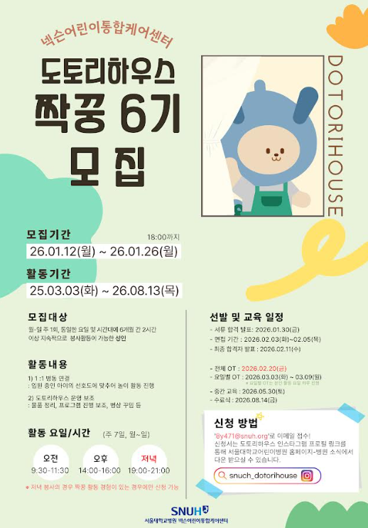 | 제목 | [서울대학교병원] 도토리하우스 봉사단 6기 모집 | 2026-01-15 |