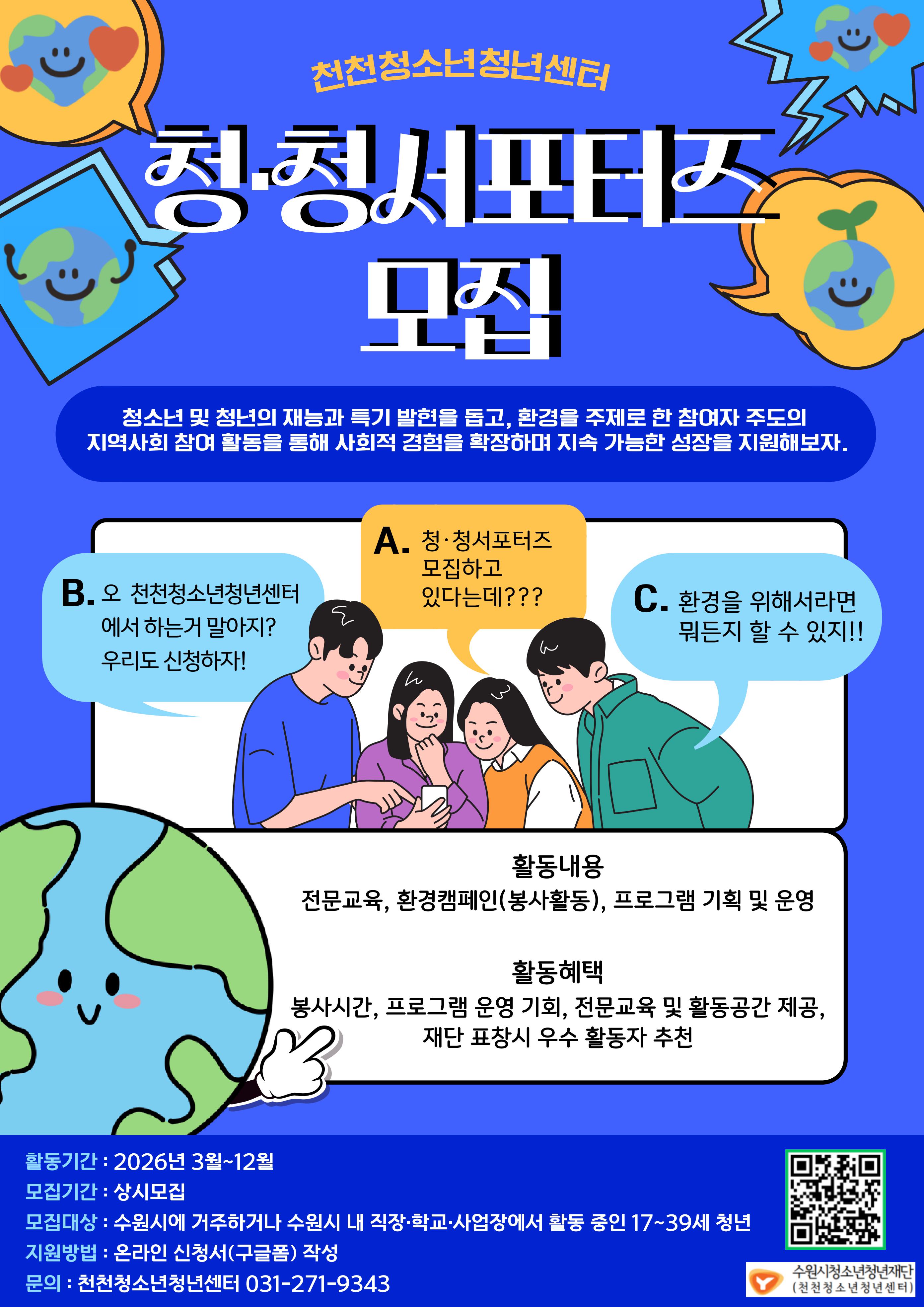 [수원시청소년청년재단] 천천청소년청년센터 청·청서포터즈 참가인원 모집 가. 운영개요 1) 활동기간: 2026. 3. ~ 12월 2) 장 소: 천천청소년청년센터 및 외부장소 3) 대 상: 수원시에 거주하거나 수원시 내 직장·학교·사업장에서 활동 중인 17~39세 청소년·청년 4) 활동내용: 전문교육, 환경캠페인(봉사활동), 프로그램 기획 및 운영 등 나. 모집개요 1) 모집기간 : 2026. 3. 14 ~ 상시모집 2) 지원방법 : 온라인 신청서 작성(네이버 폼 참가신청서 제출 https://naver.me/F7FNMae4) 다. 활동혜택 1) 활동내용에 따른 봉사시간 및 활동확인서 제공 2) 프로그램 운영 기회 제공 및 물품지원 3) 전문교육 및 활동공간 제공 4) 재단 내 표창 시 우수 활동자 추천 라. 문 의: 천천청소년청년센터 담당자 031-271-9343 (화~토, 09:00~18:00) |