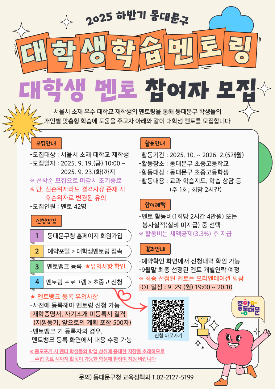 [동대문구] 2025년 하반기 동대문구 대학생 학습 멘토링 활동기간 : 2025년 10월 ~ 2026년 2월 모집일시 : 2025년 9월 19일(금) 10:00 ~ 9월 23일(화)까지 모집인원 : 42명(선착순 모집으로 마감시 종료) 활동장소 : 관내 초·중·고등학교 10개소