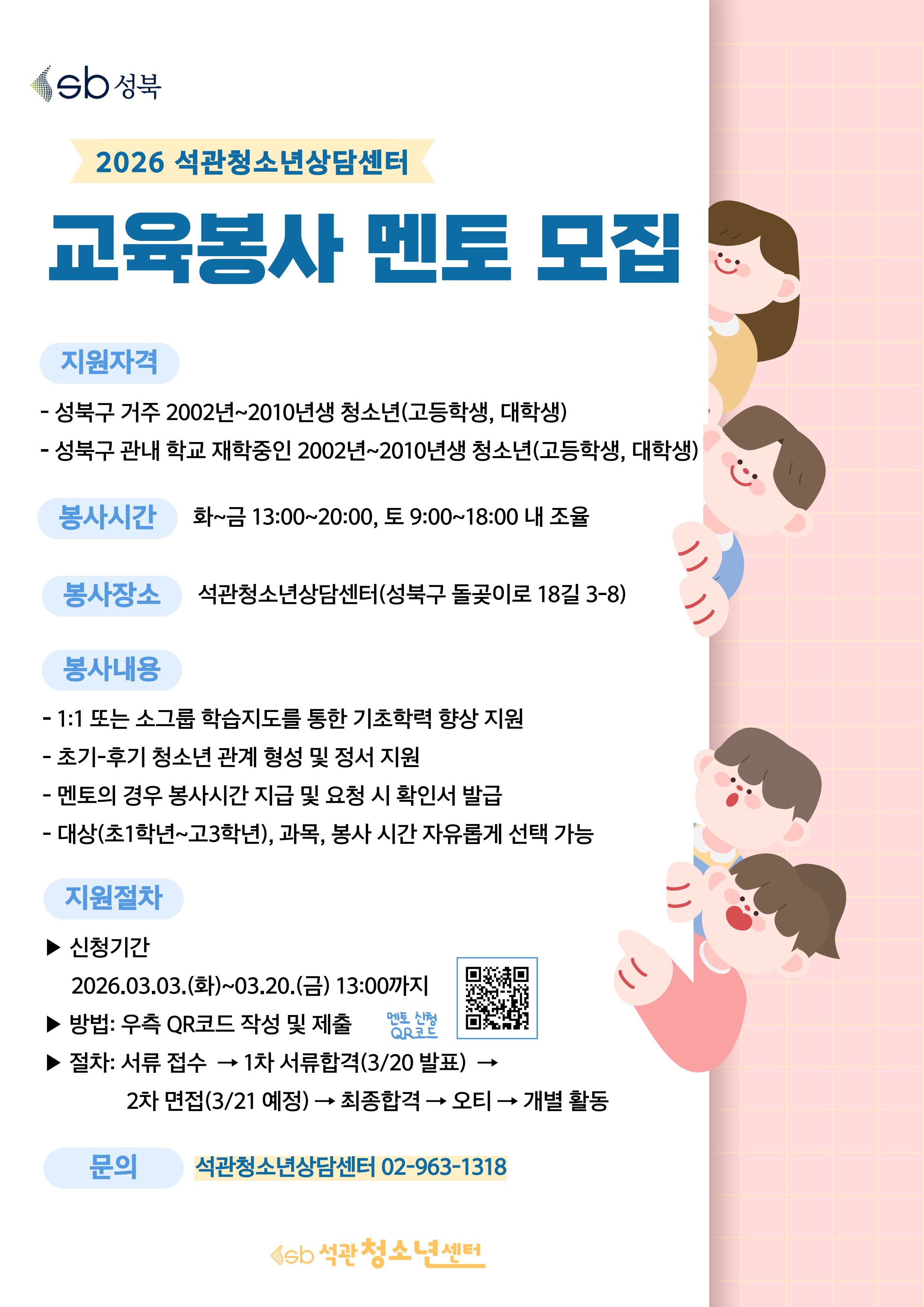 석관청소년(상담)센터 2026년 멘토(교육봉사) 모집 석관청소년(상담)센터는 청소년의 자기효능감 향상과 건강한 성장 지원을 위해 교육봉사 멘토 활동을 운영하고 있습니다. 이에 「2026년 석관청소년(상담)센터 교육봉사 멘토」를 아래와 같이 모집하오니 많은 참여 바랍니다. 가. 지원자격: 성북구 거주 혹은 성북구 관내 학교 재학 중인 2002년~2010년생 청소년(고등학생, 대학생) 나. 신청기간: 2026. 3. 3.(화)~ 3. 20.(금) 13시까지 다. 신청방법: 포스터 내 QR 코드 활용하여 신청서 작성 및 접수 라. 선발절차: 접수 → 1차 서류합격(3/20발표) → 2차 면접(3/21예정) → 최종합격 → 오티 → 개별활동 마. 활동내용: 1:1 또는 소그룹 학습지도를 통한 기초학력 향상 지원 등 바. 비고: 봉사시간 지급 및 요청 시 확인서 발급 가능 문의: Tel. 02-963-1318, 유선 문의는 화요일~토요일 가능합니다. |